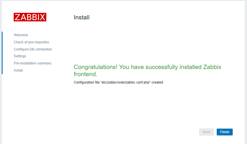 If all the settings you provided are correct, you will get a congratulatory message notifying you of the successful setup of Zabbix’s front end. Press on the ‘Finish’ button.
